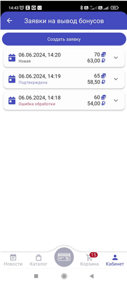 2. Все заявки будут сохраняться в этом окне: дата оформления заявки, сумма переводимых бонусов и сумма переводимых денежных средств. Каждая заявка со статусом, значения следующие: