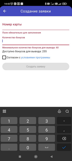 3. Нажать на кнопку «Создать заявку». При создании заявки указать номер банковской карты и количество бонусов, которое хотите перевести. При этом отображается минимальное и возможное количество бонусов.